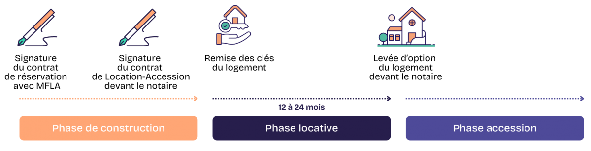 • Une phase d’accession : Après avoir loué votre logement pendant au moins 12 mois, vous avez la possibilité de devenir pleinement propriétaire en levant l’option d’achat. Cette option peut être exercée si vous avez démontré votre capacité à assurer le paiement des mensualités.